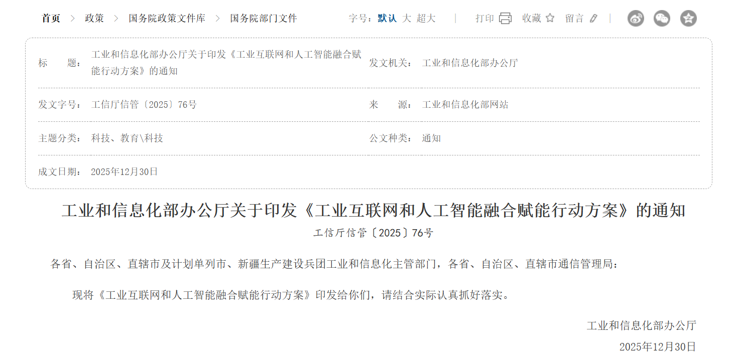人工智能是引领新一轮科技革命和产业变革的战略性技术,工业互联网是推进新型工业化的重要基础设施,人工智能加速工业互联网设施升级、能力优化、服务创新,工业互联网为人工智能工业应用提供互联通道、数据资源、平台中枢,两者互促共进、融合赋能,将进一步加快产业模式和企业组织形态变革,为推进新型工业化注入强大动力。为深入贯彻党中央、国务院决策部署,落实《国务院关于深化“互 联网+先进制造业”发展工业互联网的指导意见》《国务院 关于深入实施“人工智能+”行动的意见》有关要求,深化人工智能与工业互联网融合应用,一体推进新型工业化,助力制造强国与网络强国建设,制定本行动方案。